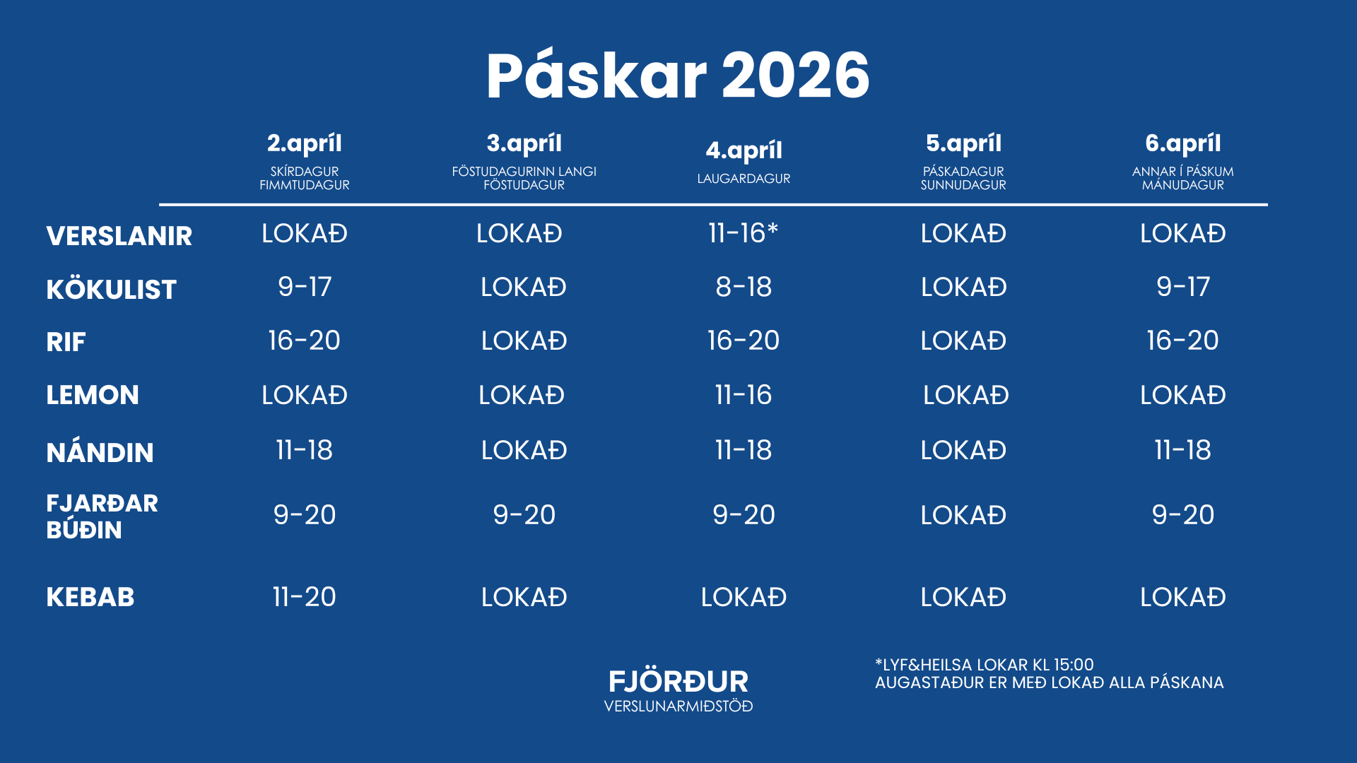 Athugið að Kökulist, Lyf&Heilsa, Rif Restaurant og Fjarðarbúðin eru með aðra opnunartíma.